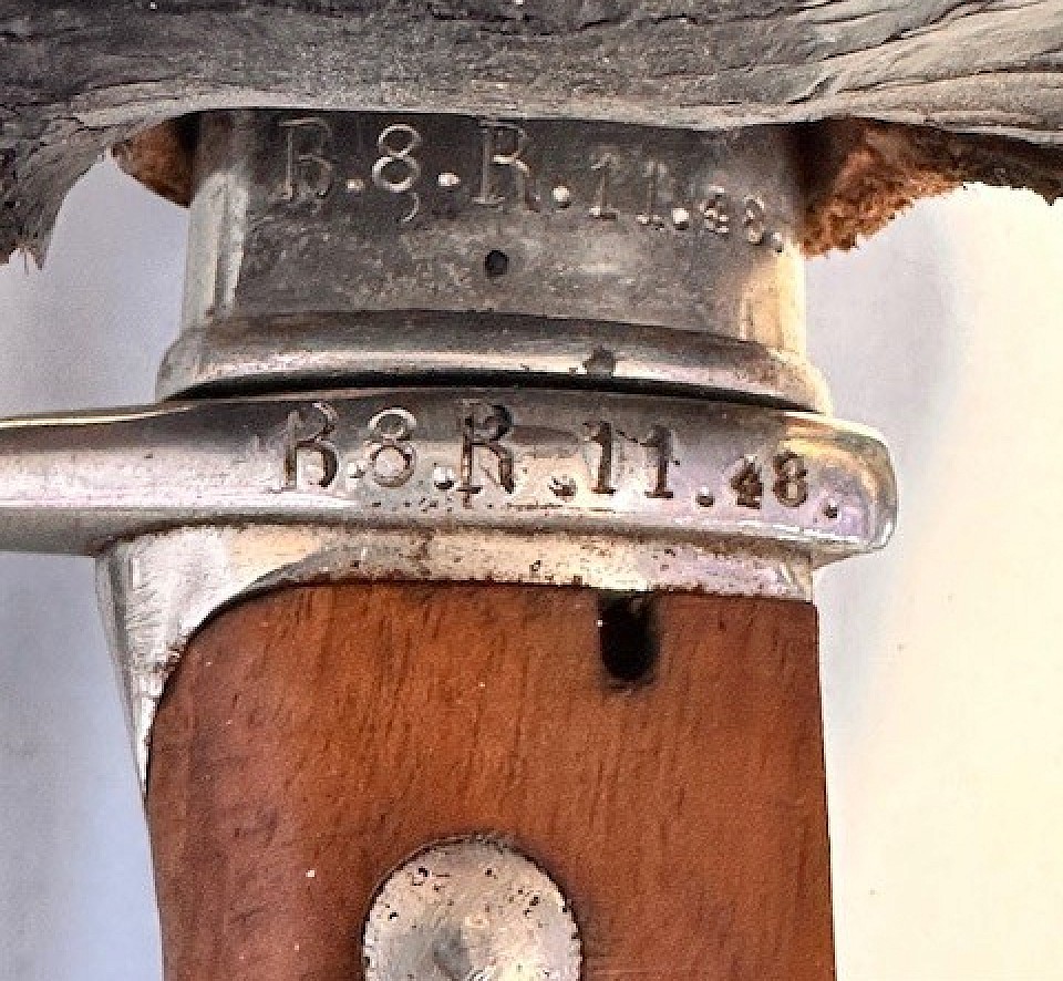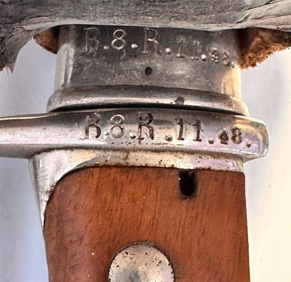 This is an outstanding example of the WWI S98 bayonet having an excellent chromed steel blade that measures about 20 1/2" long and has no sharpening, edge dings or dark spots. Both the bayonet crossguard and the scabbard throat fitting are stamped with identical issue serial number markings "B.8.R.11.48.". The handle features two near excellent grooved wood grip panels. The extremely fine undented scabbard has 100% of its original black leather covering. The nickeled scabbard fittings are also undented. This bayonet comes with its fine black patent leather frog with all six rivets intact. This S98 bayonet is a "WWIl veteran bring-back" purchased from the son of WWIl veteran Army Master Sergeant George Robinette. Master Sergeant Robinette "was one of the last to get off boats on D-Day" his son said. Master Sergeant Robinette was tasked to "go through towns and clear Nazi snipers out, that's how he got all this war stuff. MSG Robinette "sent home five steamer trunks full of all kinds of German stuff", his son said. "He kept the items in a shed in the back yard" when he returned home. "He gave a box of it (war relics) to me" which included this S98 bayonet, his son said. Item #1114-10