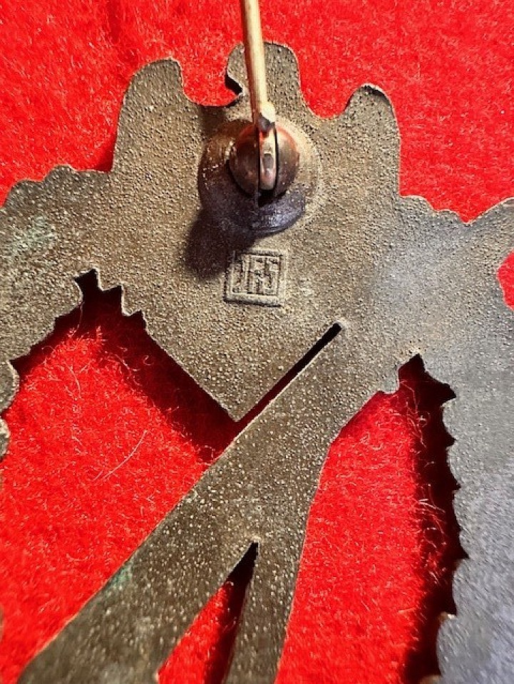 This original nicely detailed Bronze Infantry Assault Badge rates near excellent and is maker-marked "JFS". Some of the original bronze finish is still present, with its finish aging to grey over time, as it does on many Nazi badges made with Kriegsmetall late in the war. This badge was acquired from the nephew of a WWII veteran. The nephew said “I think I told you that those metals were given to me by my Father’s brother. He was part of the force that pushed the German forces up through Italy back into Germany. ( I don’t think it was 10th Mtn Div). He also gave me a “Ike” jacket. Don’t remember what happened to it. It wouldn’t fit me anymore but still wish I had it”. Here's your chance to own this original WWII veteran-bring-back badge. Item #0110-3
