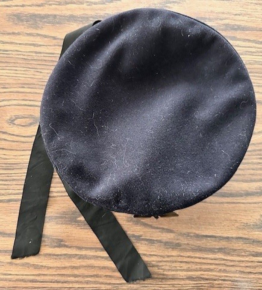 This is a fine dark blue wool sailor's cap with fitted removable top having a black silk cap tally embroidered with the title "Kriegsmarine" in yellow thread. No mothing, tears or repairs. A stickpin-style brass national eagle badge with an integral metal and composite rosette is affixed on the cap front above the ribbon. The separate dark blue wool cap body features a brown faux-leather sweatband and dark blue fabric lining. Two embroidered cloth name tag labels are sewn onto the sweatband, each featuring the original Kriegsmarine sailor’s name who once owned this cap. An ink-stamped maker’s marking also appears on the liner with the date “1938”. Item #0914-1