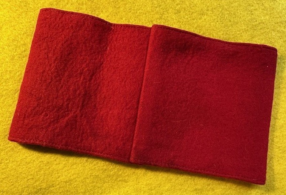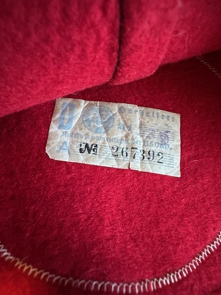 This is an extremely fine heavy red wool armband with ends that are machine-sewn together. This armband features the ribbed white center circle machine-sewn onto the red armband. The multi-piece black ribbed cloth tape swastika is machine-sewn onto the white circle. The original RZM paper tag is still affixed inside the armband. Just several very small surface moth nips and light age darkening to the white circle. Item #0120-1