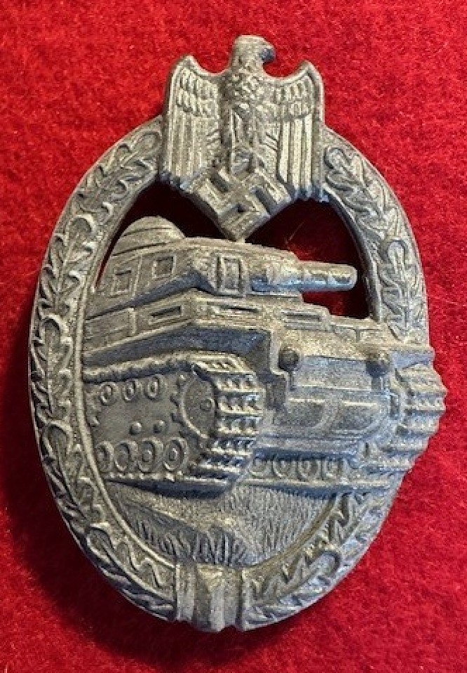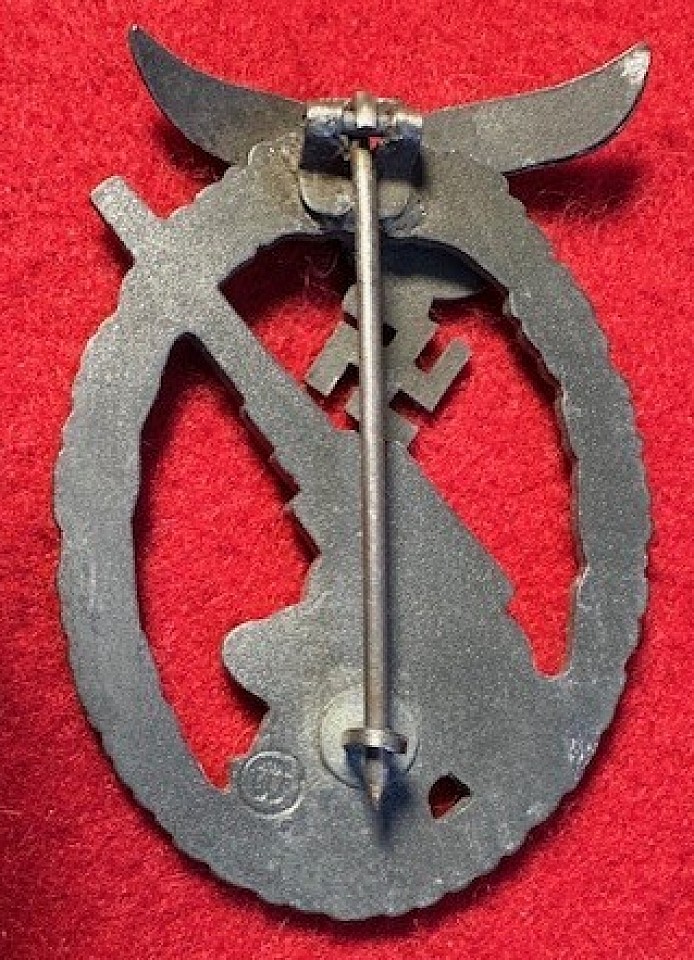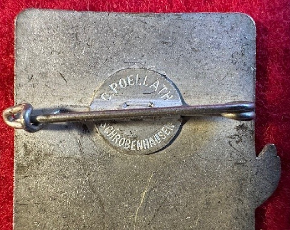 These two "WW2 vet bring-back" badges are near excellent 1934 SA/SS "Berchtesgaden Skimeisterschaften Erinnerungsabzeichen)" badges of silver-finished bronze with multi-colored enamels. Both have a horizontal pinback, the reverse maker marked “C. POELLATH, SCHROBENHAUSEN”. Each measures about 1 7/8" high. These two badges are WW2 veteran bring-backs purchased from the grand-daughter who stated "My grandfather, Wallace “Buck” Desadier, Jr., was in the Army 101st Airborne during WWII. He earned several medals for his participation in the Battle of the Bulge". Item 0831-1