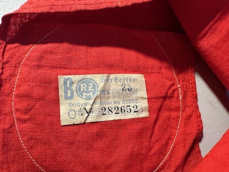 This is a very fine armband with the SA sports badge design embroidered in gold thread onto the white center circle, which is separately machine-sewn onto the red armband. The armband's upper and lower edges are reinforced with stitching, with the armband ends machine-sewn together. The paper RZM tag is still affixed inside the armband. No holes or tears, just some light age soiling. Item #0206-1