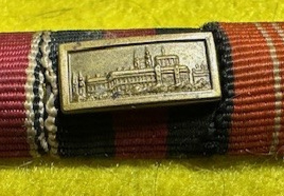 This is a very fine five-ribbon bar with the convex metal backing plate (the mounting pin is missing but the catch and hinge loop are present). This ribbon bar features three metal devices including the scarcer Prague Castle Bar (Spange Prager Burg für die Medaille zur Erinnerung an den 1. Oktober 1938) which I've seen sell for $55 alone. This ribbon bar measures about 3" in length. This ribbon bar is a WW2 veteran "bring-back" obtained from the niece of the veteran.